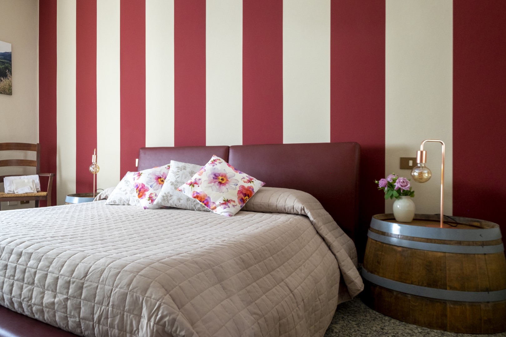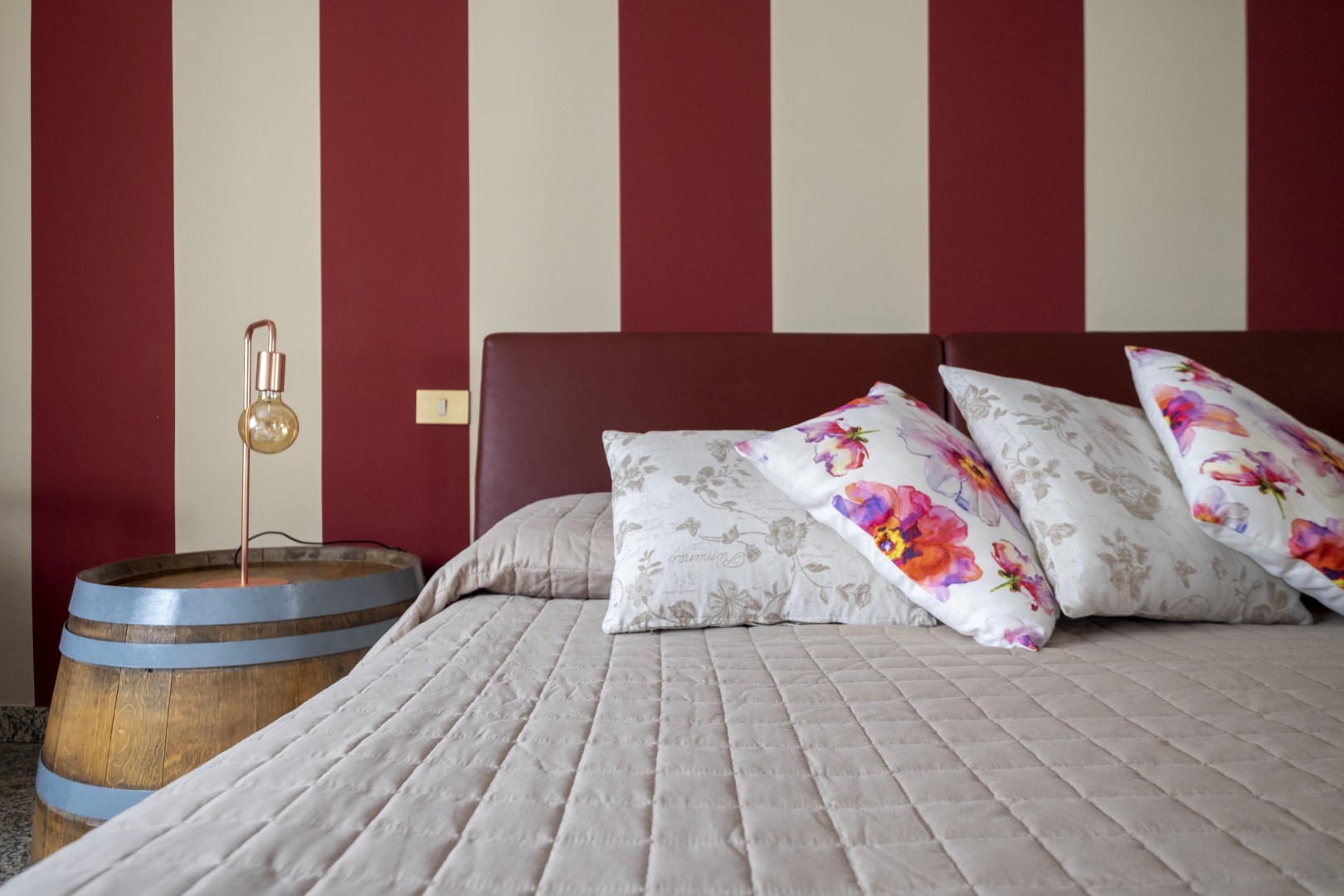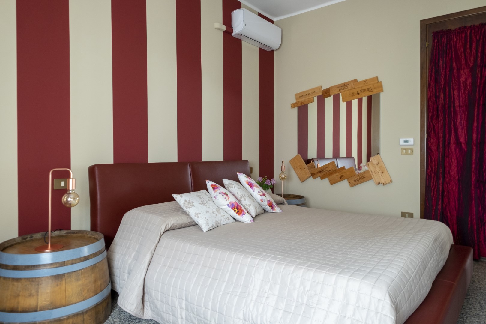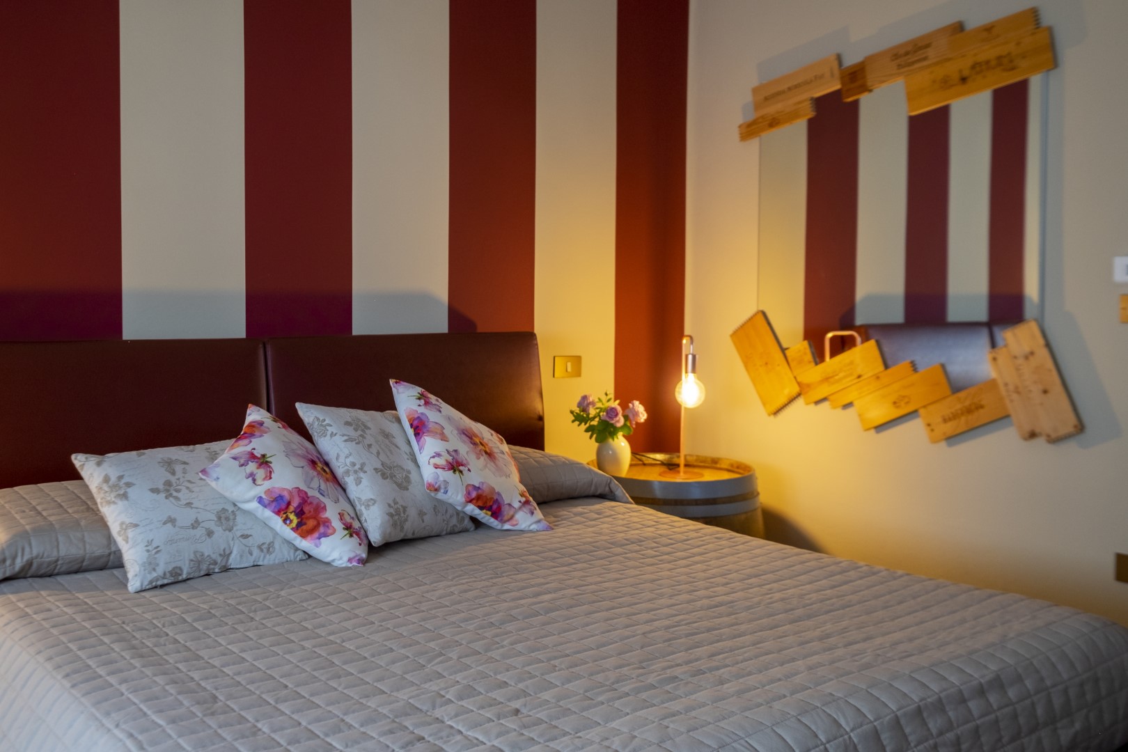 Arredamento originale con barrique riutilizzata per realizzare i comodini.