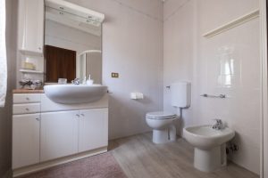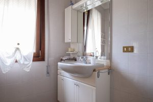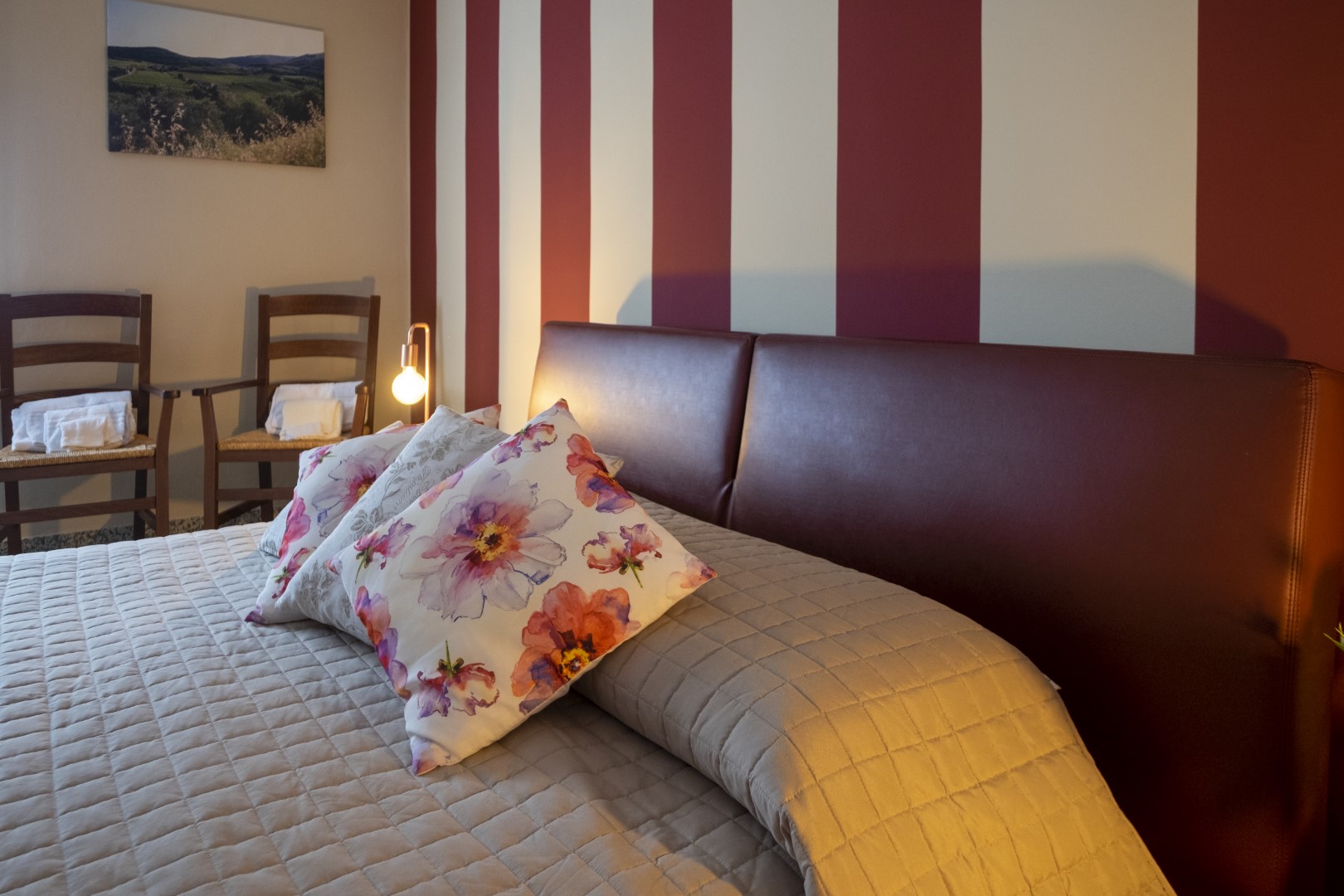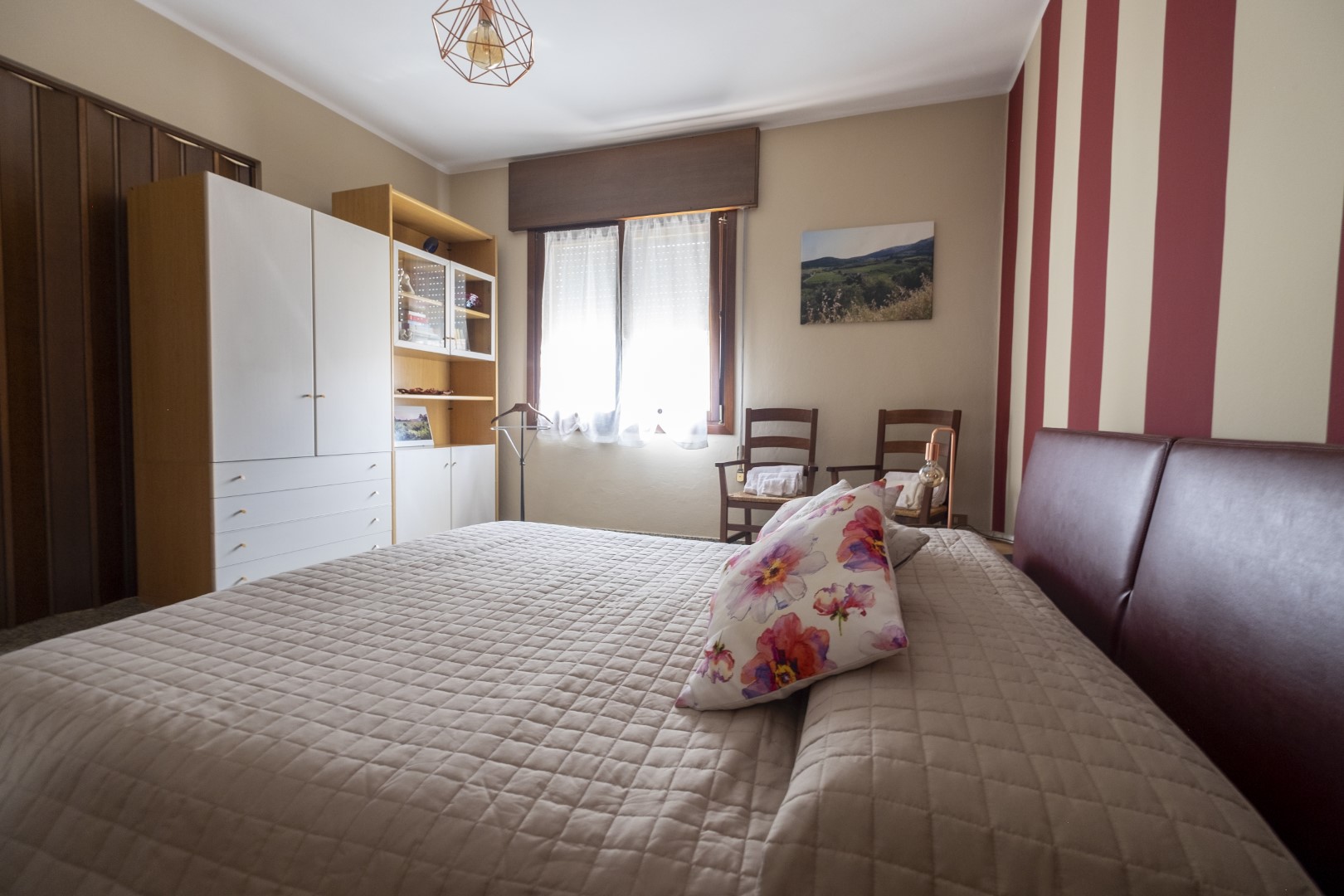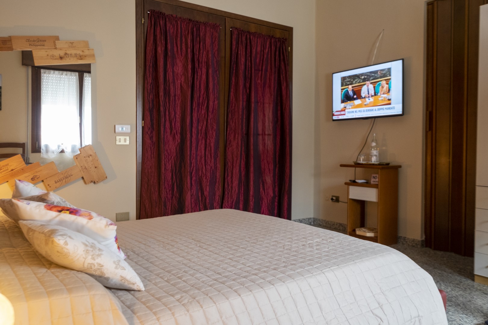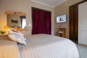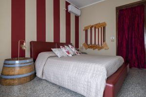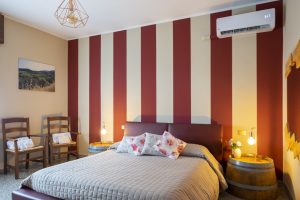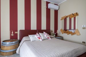Ampia camera matrimoniale con terzo letto a richiesta. Il bagno è nel corridoio, a uso esclusivo per questa stanza. Grande specchio con cassette di vino.